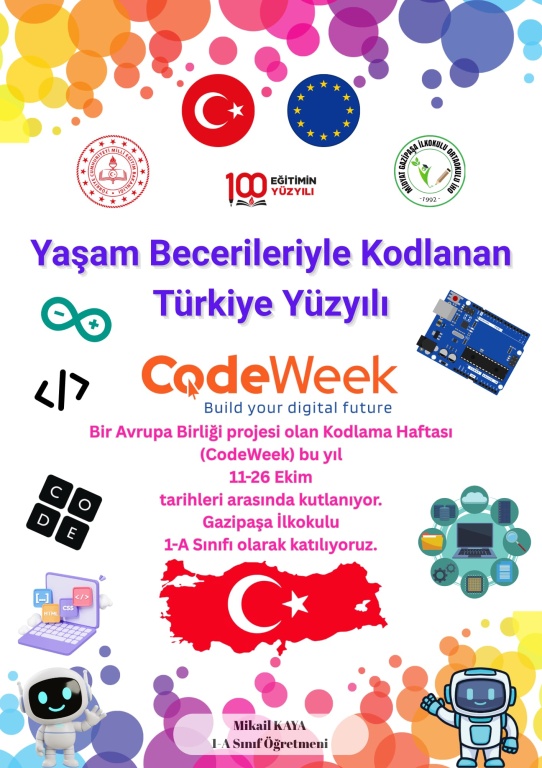 11-26 Ekim 2025 tarihleri arasında gerçekleşecek Kodlama Haftası (Codeweek) etkinliklerine Gazipaşa İlkokulu 1-A Sınıf öğretmeni Mikail KAYA rehberliğinde katılım sağlayacağız.